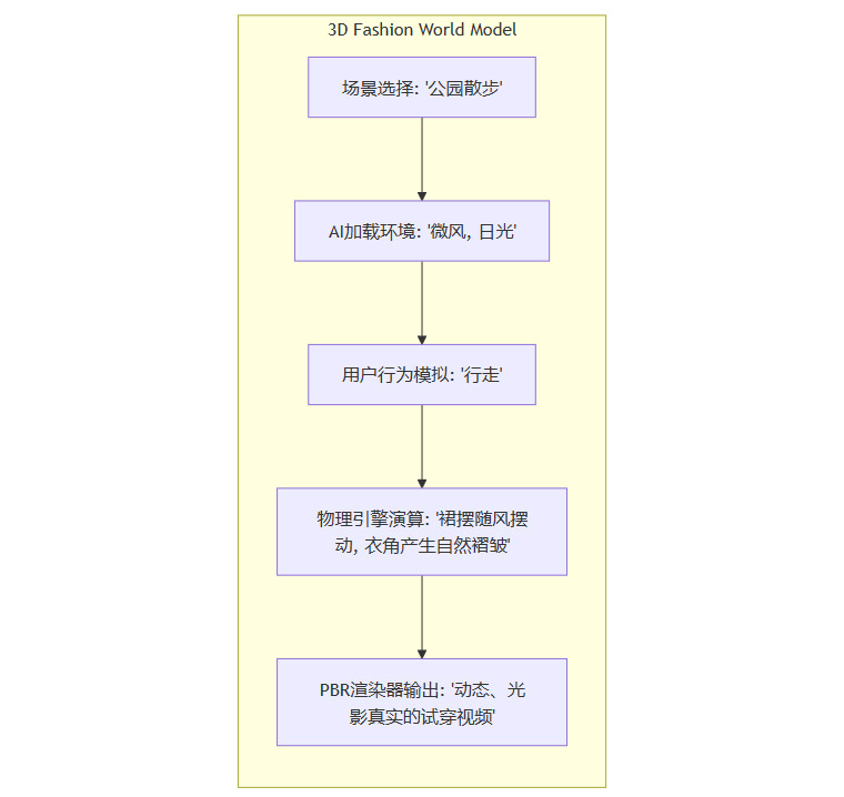 为了构建真正的下一代穿搭平台,我们的技术架构将超越简单的3D试衣,引入“3D时尚世界模型”(3D Fashion World Model)的概念。传统的3D试衣,更像是在一个静态的数字模特身上“贴图”。而3D时尚世界模型则追求一个动态、可交互、且符合物理与社会规律的虚拟环境。它由AI驱动,能够理解和预测“人-衣-场”之间的复杂互动。