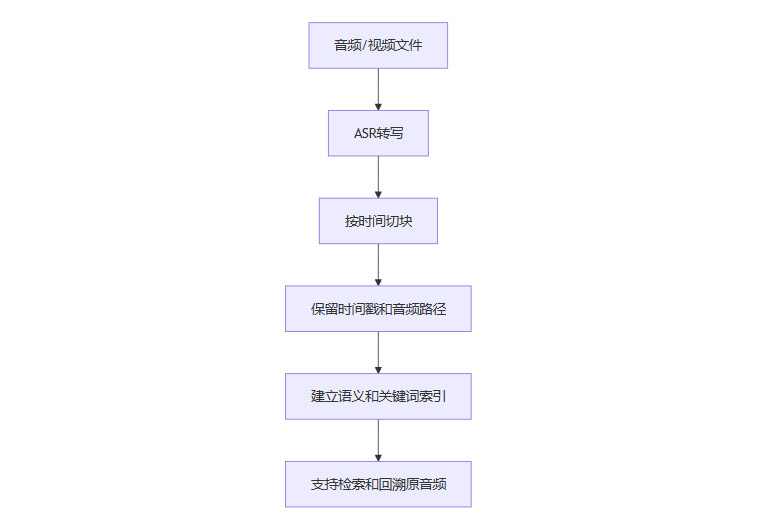 音频 | ASR转写为文本,按时间切块,保留时间戳和原音频路径 | Whisper、讯飞ASR等 |