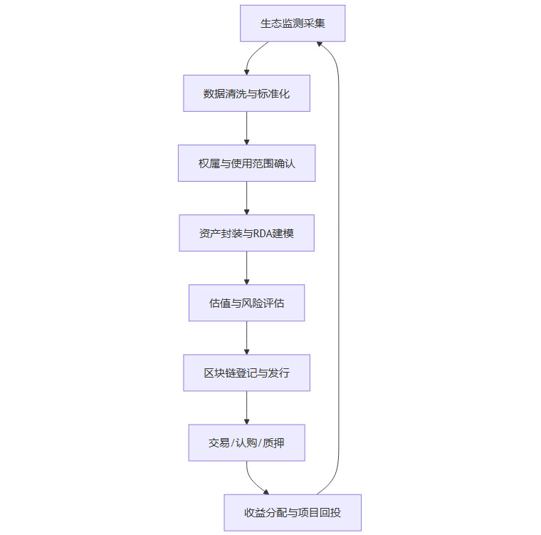 围绕游客的小额碳汇 RDA 认购,可以构建一个完整且可重复的交互闭环,使这一功能从单次捐赠行为升级为有连续体验的参与路径。整个闭环大致包括资产展示、认购与登记、信息回流和年度总结几个阶段,每一环节都与底层 RDA 系统相对应。