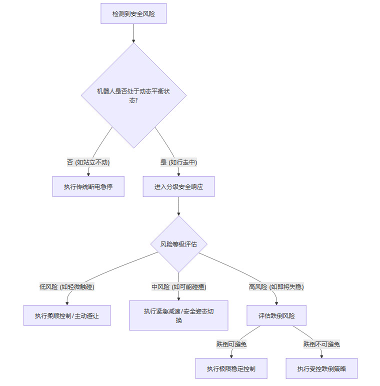 但对于一个正在行走的双足机器人,这样做只会导致其失去动力,立刻摔倒。一个一百多公斤的金属物体失控倒下,其造成的二次伤害可能比原始风险更大。这就要求一套全新的、更精细化的安全控制策略。