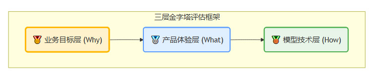 科学的模型效果评估体系,其核心是确保技术指标最终服务于产品体验和业务价值。业界最常用且行之有效的结构,便是“三层金字塔”分层框架。它自上而下进行设计,又自下而上进行验证,形成了一个逻辑严密的闭环。