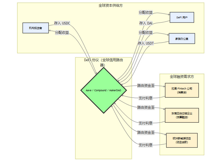 在HyFi范式下,Aave、Compound等DeFi协议的角色将发生根本性转变。它们将不再仅仅是加密资产的借贷平台,而是演变为连接全球资本与实体经济融资需求的全球信用路由器(Global Credit Router)。