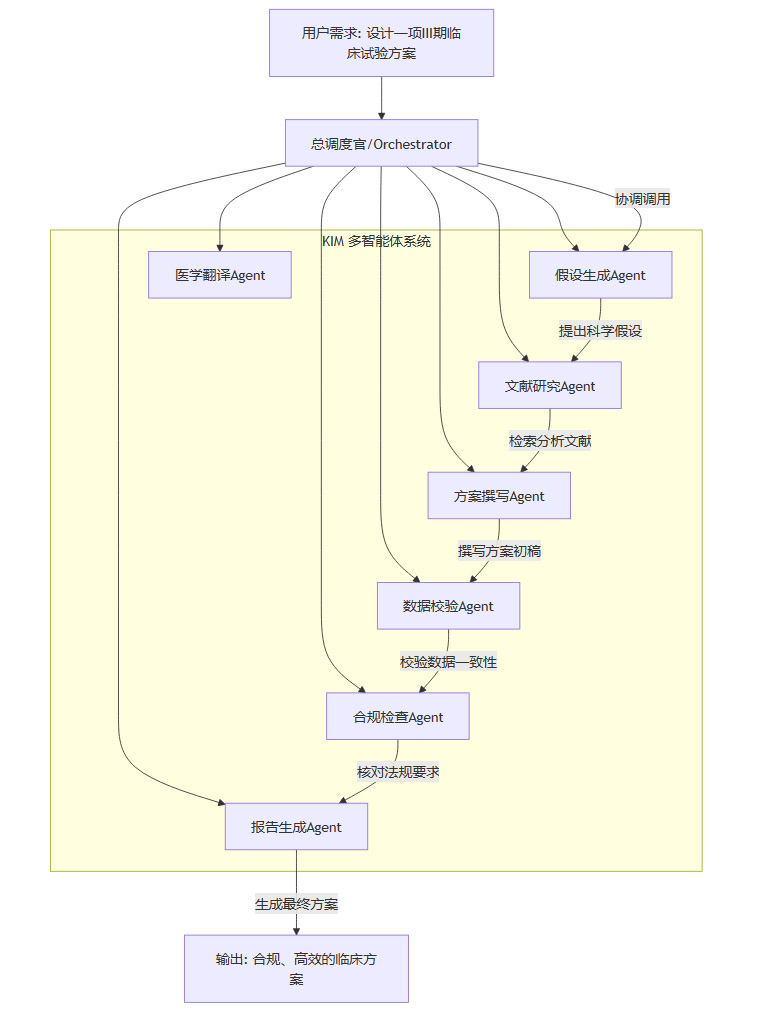 这标志着DIP完成了从“AI工具提供商”到**“临床研发智能体(Agent)构建者”的战略升级。它不再是训练一个模型来被动地回答问题,而是打造了一个由多个、各自扮演不同专家角色的AI代理(Agent)协同工作的动态智能矩阵,其内部代号为KIM(Knowledge-driven Intelligence Matrix)架构**。