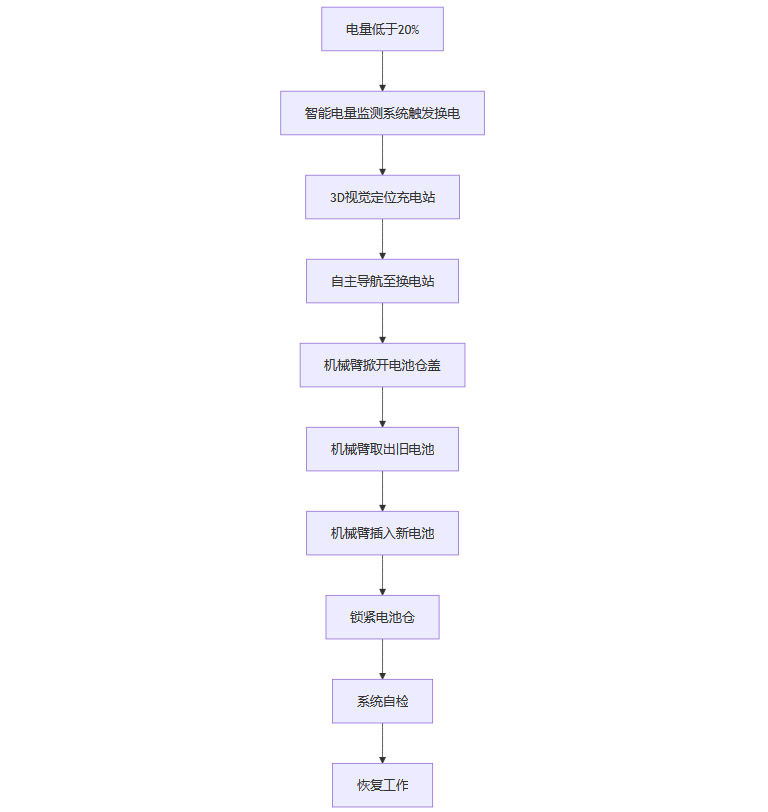 当电量降至20%,机器人自动启动换电程序,无需人工干预
