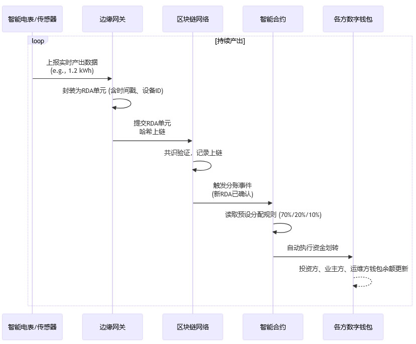 规则预设:项目各参与方(如电站投资人、运维方、购电方)提前将收益分配规则写入智能合约。例如,合约规定:每产生一度电的RDA,其收益的70%归投资人,20%归业主方,10%作为运维费用。