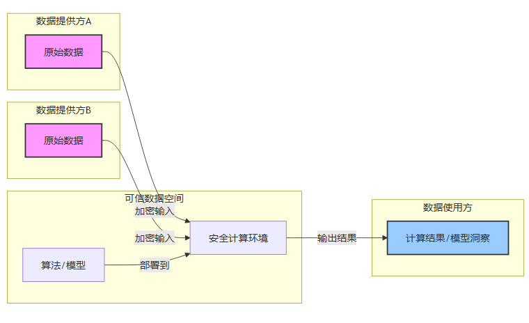 在这种模式下,多方可以将自己的原始数据留在本地,仅将加密后的数据或计算能力贡献到一个安全的环境中进行联合计算或模型训练。数据使用方只能得到最终的计算结果或模型洞察,无法接触到任何一方的原始数据。