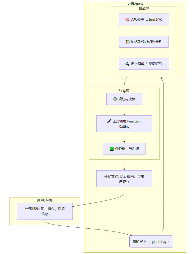 身份Agent,则是一个主动的、具备内在驱动力的智能体。它不仅拥有外在形象,更重要的是,它开始拥有“内在世界”——一个由你的个人数据、历史行为、沟通风格所塑造的“人格模型”。