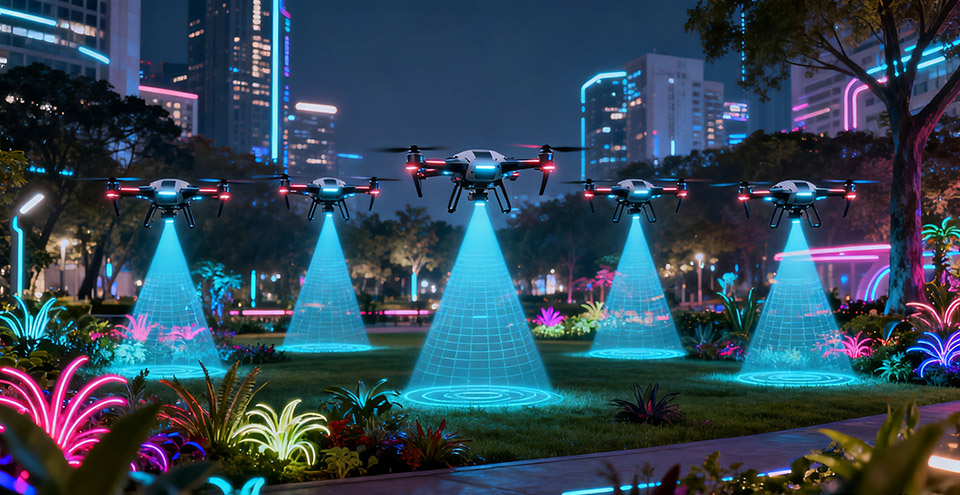 传统的无人机集群表演或作业,高度依赖地面站的集中式控制,路径预先规划,灵活性差。边缘计算则赋予了集群真正的自主协同能力。