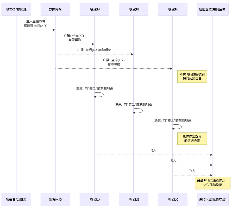 在这个场景中,东侧的“安全”空域因为所有飞行器的同步涌入,瞬间变成了一个密度极高、碰撞风险极大的“决策黑洞”。这个黑洞并非由物理障碍物造成,而是完全由错误信息凭空制造出来的。这充分暴露了高度依赖数据协同的系统,在面对信息污染时的内在脆弱性。
