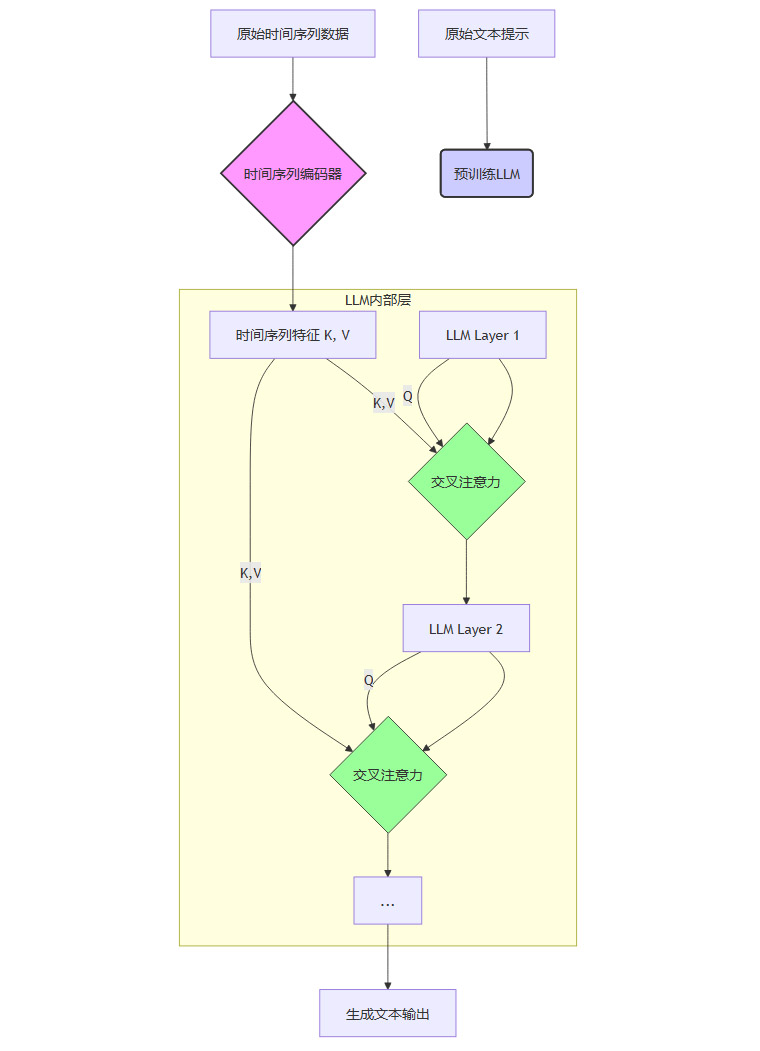 交叉注意力桥梁。在LLM的每一层(或特定几层)中,插入一个额外的交叉注意力模块。当LLM在生成文本时,这个模块会“暂停”一下,将当前的文本表示作为查询(Query),去时间序列编码器输出的特征中“检索”(Key-Value)相关信息。