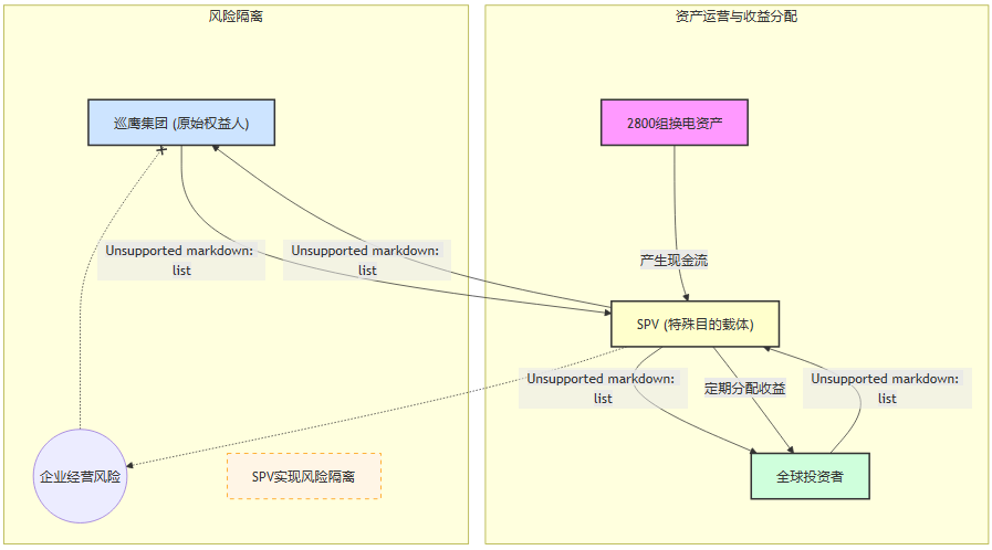 如上图所示,巡鹰集团首先将其拥有的2800组换电资产的未来收益权,真实出售并转移给一个为此项目专门设立的SPV。这一操作的核心目的在于风险隔离: