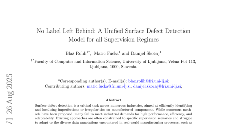 现在,这个选手登场了。来自卢布尔雅那大学计算机与信息科学学院的三位研究者Blaz Rolih、Matic Fucka和Danijel Skocaj,带来了他们的杰作——SuperSimpleNet。这项研究成果的论文《No Label Left Behind: A Unified Surface Defect Detection Model for all Supervision Regimes》已公开发表(arXiv:2508.19060),并且代码也已在GitHub上开源(https://github.com/blaz-r/SuperSimpleNet),为整个行业带来了全新的解决方案。