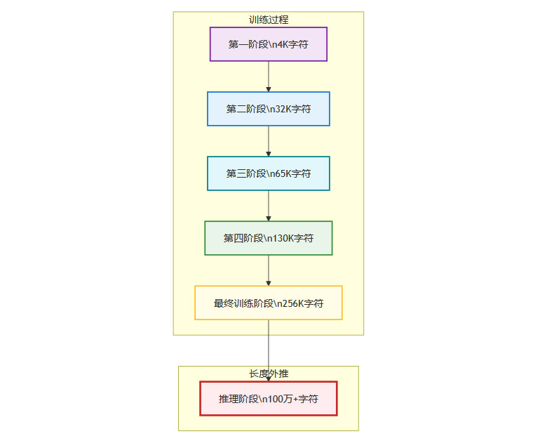 让一个模型直接学会处理百万字符的文本,既不现实也无效率。Qwen团队采用了“渐进式扩容”(Progressive Scaling)的训练策略,这个过程可以比作教一个学生游泳。