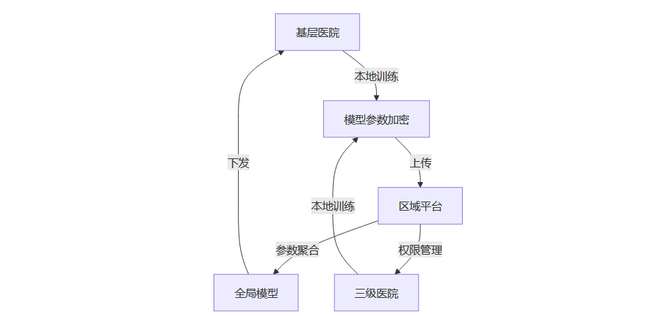 医院在本地训练模型后,将加密后的模型参数上传至云端服务器。服务器在密文状态下完成参数聚合,只有授权用户才能解密查看,兼顾了云端计算资源和数据安全。