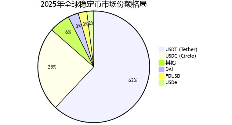 2025年的稳定币市场,与其说是百花齐放,不如说是**“两超多强”**的格局。Tether公司发行的USDT和Circle公司发行的USDC,如两颗引力巨大的恒星,吸引了市场中绝大部分的质量。