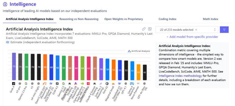 AAII指数(Artificial Analysis Intelligence Index):综合多项能力单项评测结果,覆盖知识推理、数学、编程等领域,成为衡量AI模型智能水平的重要指标(数据来源:Artificial Analysis Intelligence Index, 2025)。