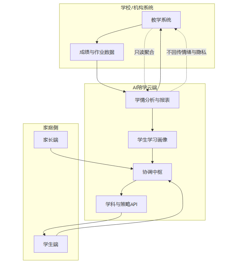 学校和机构系统可以向 AI 云端上传作业和考试数据,用于生成聚合学情分析。云端只向学校回传学科表现层面的统计数据,不过多涉及家庭端的情绪与隐私信息。家庭侧的学习与情绪数据,主要服务个人和家长端视图,不作为学校层面决策依据。